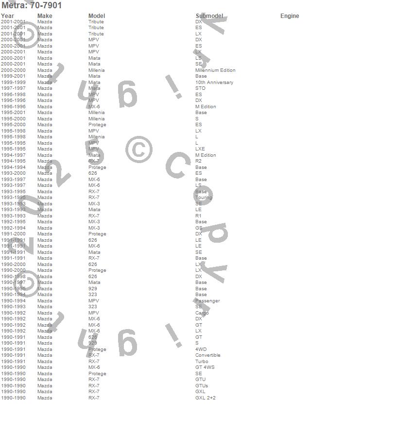 323, 626, 929, Miata, Millenia, MPV, MX-3, MX-6, Protege, RX-7, Tribute, Mazda, 2001, 2000, 1999, 1998, 1997, 1996, 1995, 1994 more…