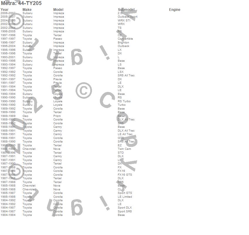 385, Camry, Corolla, Impreza, Loyale, Nova, Paseo, Previa, Prizm, Tercel, Chevrolet, Geo, Peterbilt, Subaru, Toyota, 2007, 2006, 2005, 2004, 2003 more…