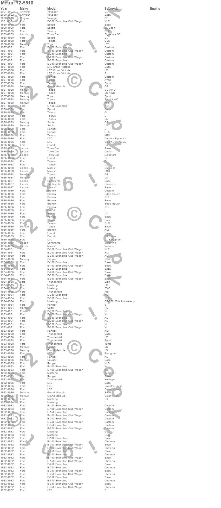 Bronco, Bronco II, Capri, Continental, Cougar, E-100 Econoline, E-100 Econoline Club Wagon, E-150 Econoline, E-150 Econoline Club Wagon, E-250 Econoline, E-250 Econoline Club Wagon, E-350 Econoline, E-350 Econoline Club Wagon, Escort, Grand Marquis, LTD, LTD Crown Victoria, Mark VII, Mustang, Ranger more…