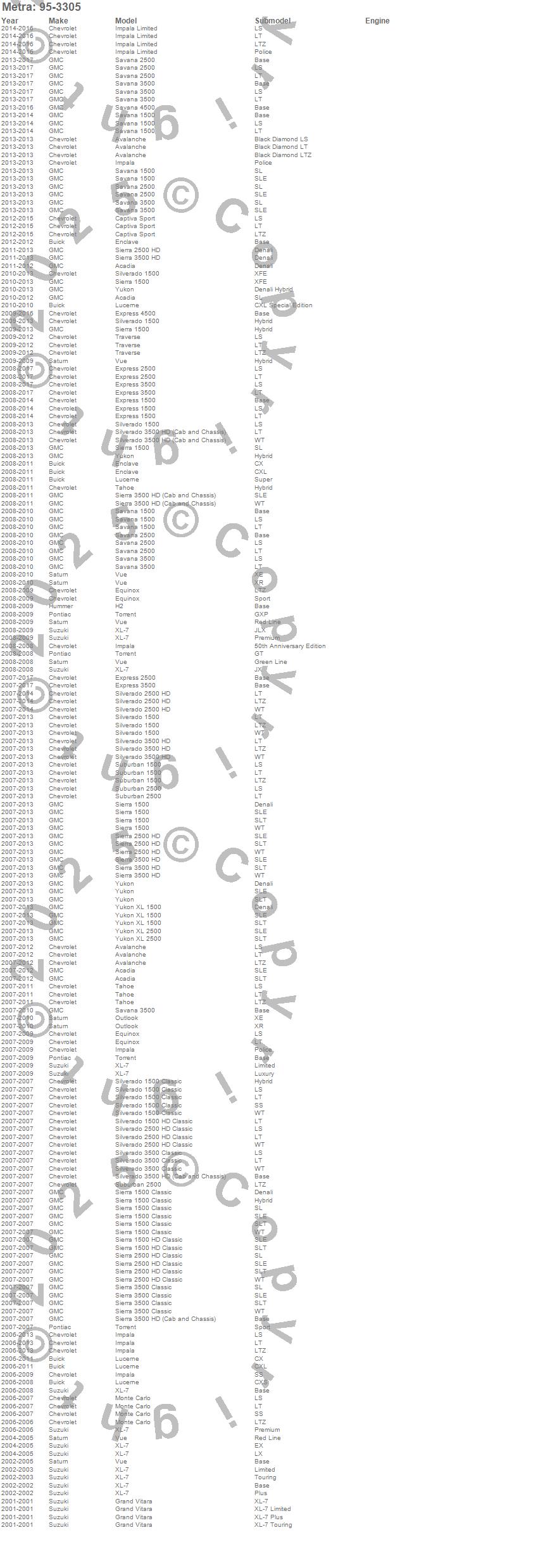 Acadia, Avalanche, Enclave, Equinox, Express 1500, Express 2500, Express 3500, Grand Vitara, H2, Impala, Lucerne, Monte Carlo, Outlook, Savana 1500, Savana 2500, Savana 3500, Sierra 1500, Sierra 2500 HD, Sierra 3500 HD, Silverado 1500 more…