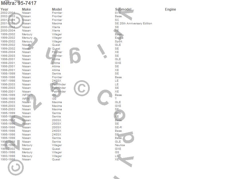 200SX, 240SX, Altima, Frontier, I30, Maxima, Pathfinder, Quest, Sentra, Villager, Xterra, Infiniti, Mercury, Nissan, 2004, 2003, 2002, 2001, 2000, 1999 more…