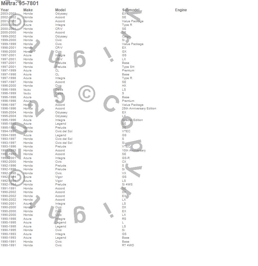 Accord, Civic, Civic del Sol, CL, CR-V, Integra, Legend, Oasis, Odyssey, Prelude, TL, Vigor, Acura, Honda, Isuzu, 2004, 2003, 2002, 2001, 2000 more…