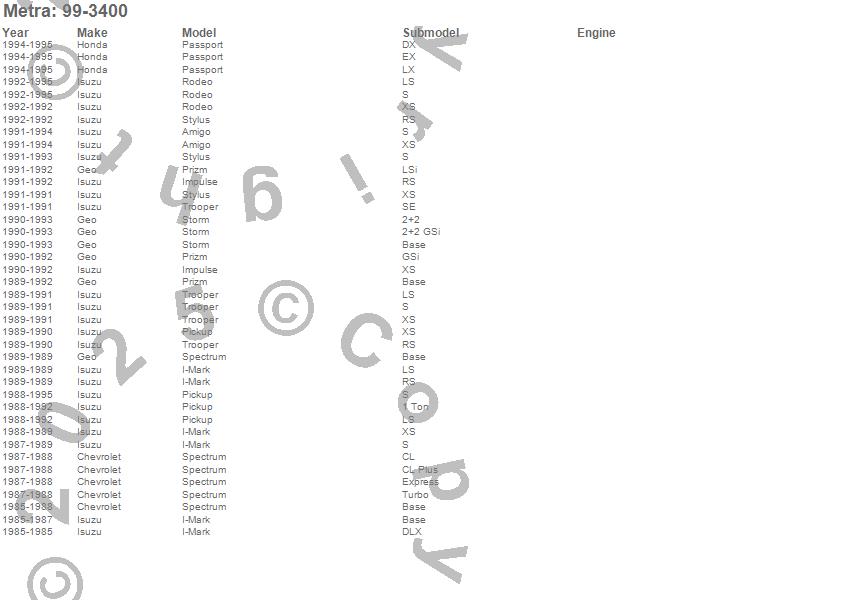 Amigo, I-Mark, Impulse, Passport, Pickup, Prizm, Rodeo, Spectrum, Storm, Stylus, Trooper, Trooper II, Chevrolet, Geo, Honda, Isuzu, 1995, 1994, 1993, 1992 more…