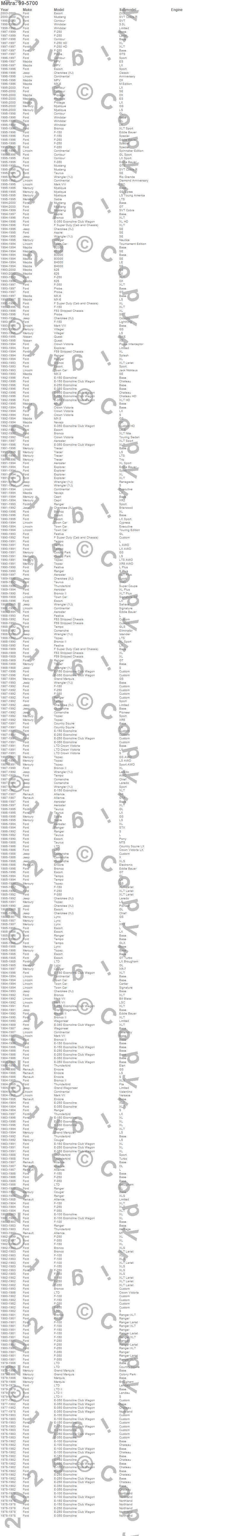 626, Aerostar, Alliance, Aspire, B2300, B3000, B4000, Bronco, Bronco II, Capri, Cherokee (XJ), Colony Park, Comanche, Continental, Contour, Cougar, Country Squire, Crown Victoria, E-100 Econoline, E-100 Econoline Club Wagon more…