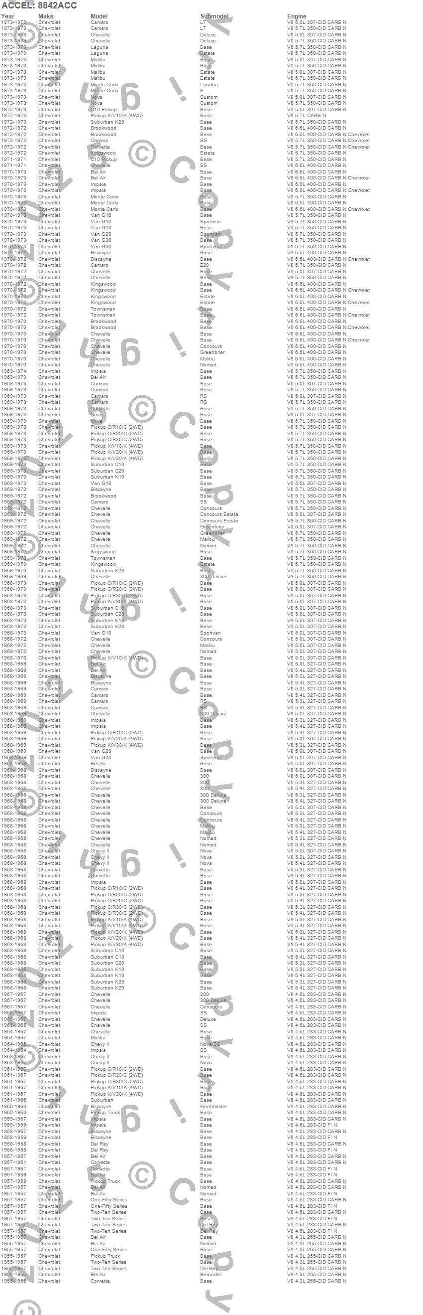 Bel Air, Biscayne, Brookwood, C10 Pickup, C10 Suburban, C20 Pickup, C20 Suburban, C30 Pickup, Camaro, Chevelle, Chevy II, Corvette, Del Ray, G10 Van, G20 Van, G30 Van, Impala, K10 Pickup, K10 Suburban, K20 Pickup more…
