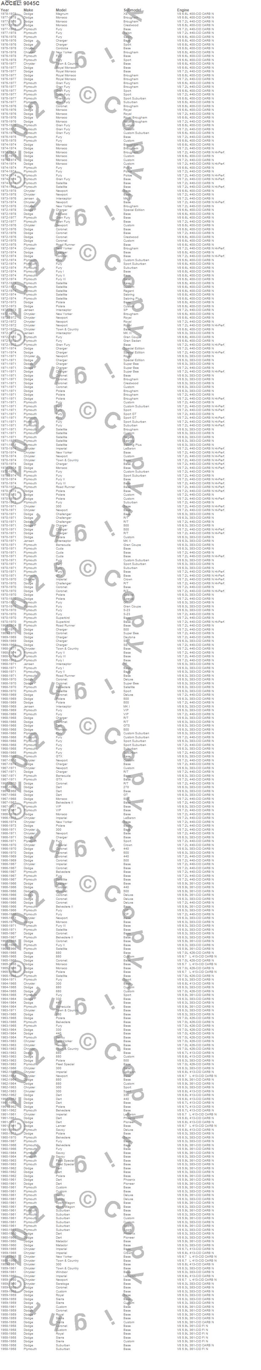 300, 330, 440, 880, Barracuda, Belvedere, Belvedere II, Challenger, Charger, Cordoba, Coronet, Cuda, Custom, Dart, Fleet Special, Fury, Fury I, Fury II, Fury III, Gran Fury more…