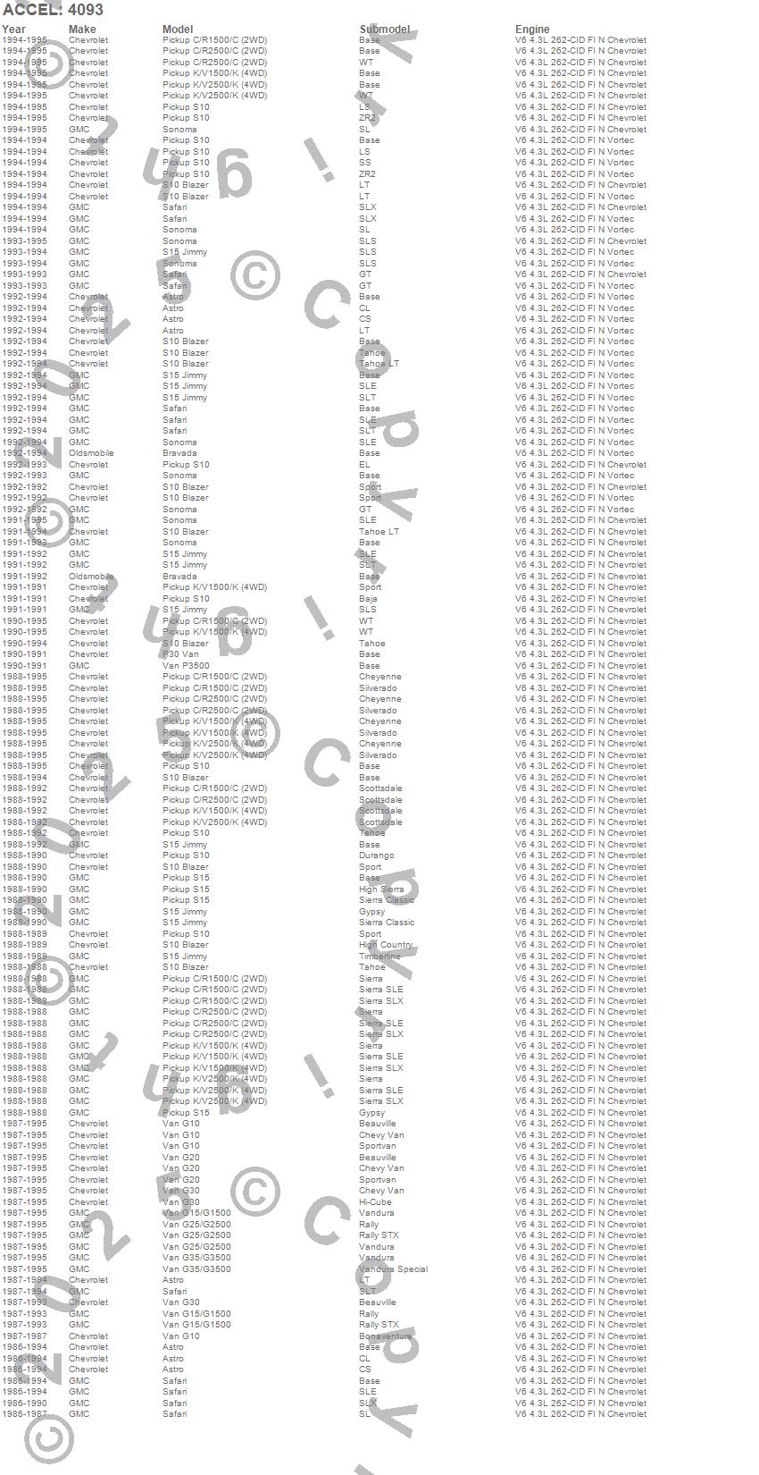 Astro, Bravada, C1500, C1500 Pickup, C2500 Pickup, G10 Van, G15/G1500 Van, G20 Van, G25/G2500 Van, G30 Van, G35/G3500 Van, K1500 Pickup, K2500 Pickup, P30 Van, P3500 Van, S10 Blazer, S10 Pickup, S15 Jimmy, S15 Pickup, Safari more…