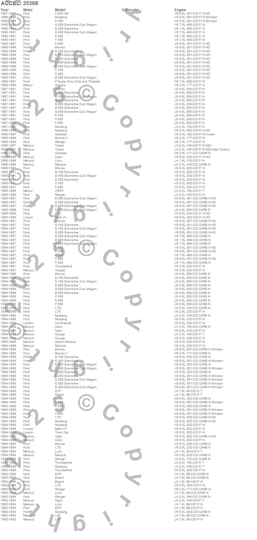 Aerostar, Bronco, Bronco II, Capri, Continental, Cougar, E-150 Econoline, E-150 Econoline Club Wagon, E-250 Econoline, E-250 Econoline Club Wagon, E-350 Econoline, E-350 Econoline Club Wagon, Escort, EXP, F Super Duty, F-150, F-250, F-350, Grand Marquis, LN7 more…