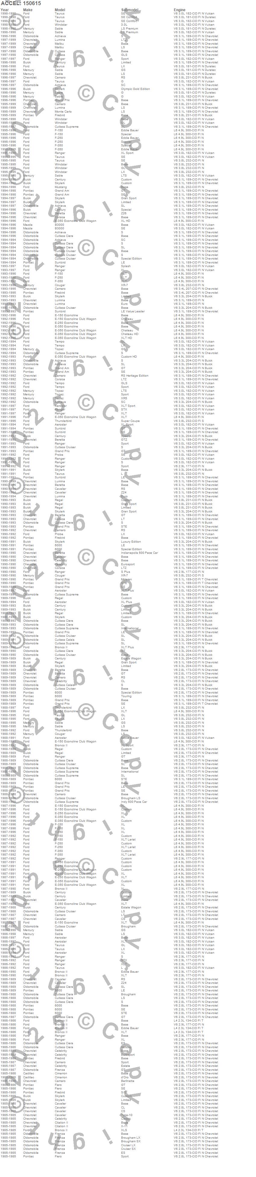 6000, Achieva, Aerostar, B3000, Beretta, Bronco II, Camaro, Cavalier, Celebrity, Century, Cimarron, Citation II, Corsica, Cougar, Cutlass, Cutlass Calais, Cutlass Ciera, Cutlass Cruiser, Cutlass Supreme, E-150 Econoline more…