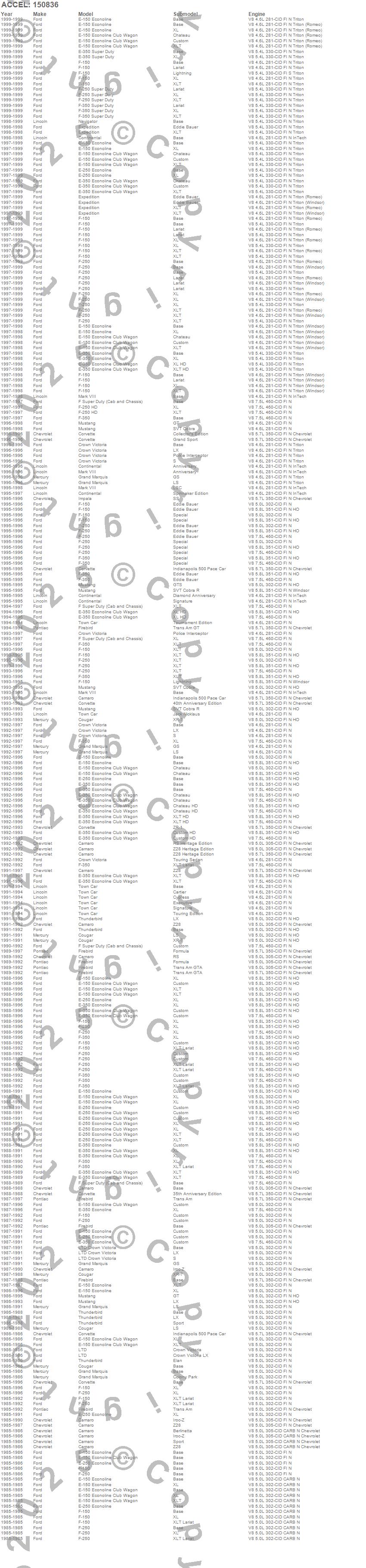 Camaro, Continental, Corvette, Cougar, Crown Victoria, E-150 Econoline, E-150 Econoline Club Wagon, E-250 Econoline, E-250 Econoline Club Wagon, E-350 Econoline, E-350 Econoline Club Wagon, E-350 Super Duty, Expedition, F Super Duty, F-150, F-250, F-250 Super Duty, F-350, F-350 Super Duty, Firebird more…
