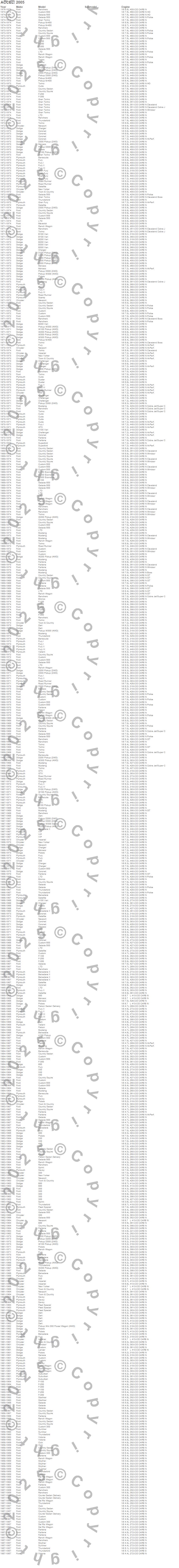 300, 330, 440, 880, A100 Truck, A100 Van, B100 Van, B200 Van, B300 Van, Barracuda, Belvedere, Belvedere II, Bronco, Challenger, Charger, Club Cargo, Coronet, Country Sedan, Country Squire, Courier Sedan Delivery more…