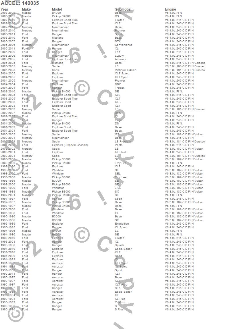 Aerostar, B3000, B4000, Explorer, Explorer Sport Trac, Mountaineer, Mustang, Probe, Ranger, Sable, Taurus, Tempo, Windstar, Ford, Mazda, Mercury, 2011, 2010, 2009, 2008 more…