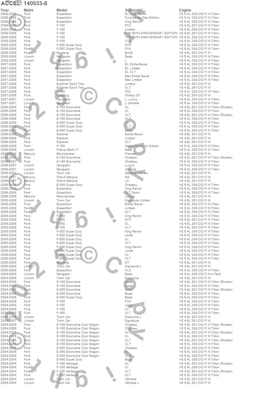 E-150 Econoline, E-150 Econoline Club Wagon, E-250 Econoline, E-250 Super Duty, E-350 Econoline Club Wagon, E-350 Super Duty, E-450 Super Duty, Expedition, Explorer, Explorer Sport Trac, F-150, F-150 Heritage, F-250 Super Duty, F-350 Super Duty, Grand Marquis, GT, Mark LT, Mountaineer, Mustang, Navigator more…