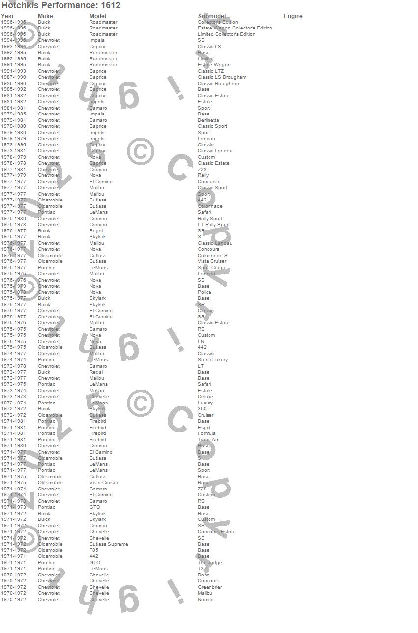 442, 98, Bonneville, Camaro, Caprice, Catalina, Century, Chevelle, Commercial Chassis, Custom Cruiser, Cutlass, Cutlass Salon, Cutlass Supreme, Cutlass Tiara, Delta 88, El Camino, Electra, Estate Wagon, F85, Firebird more…