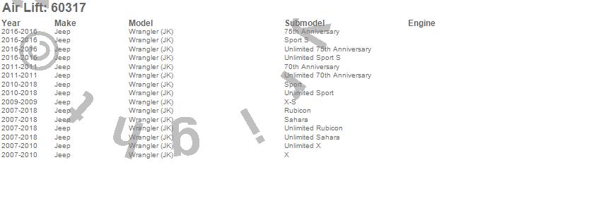 Below is an abreviated list of applications for the Air Lift 1000 Replacement Bag.