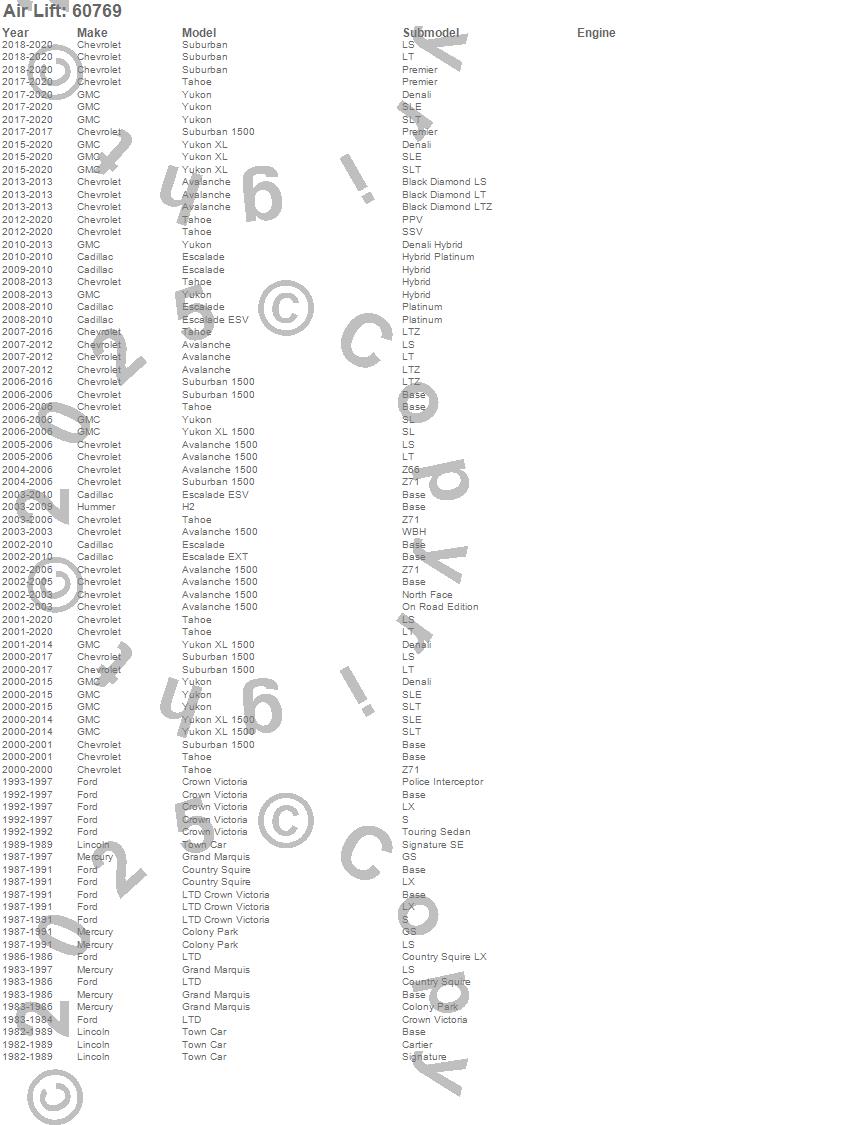 Avalanche, Avalanche 1500, Colony Park, Country Squire, Crown Victoria, Escalade, Escalade ESV, Escalade EXT, Grand Marquis, H2, LTD, LTD Crown Victoria, Suburban 1500, Tahoe, Town Car, Yukon, Yukon XL, Yukon XL 1500, Cadillac, Chevrolet more…