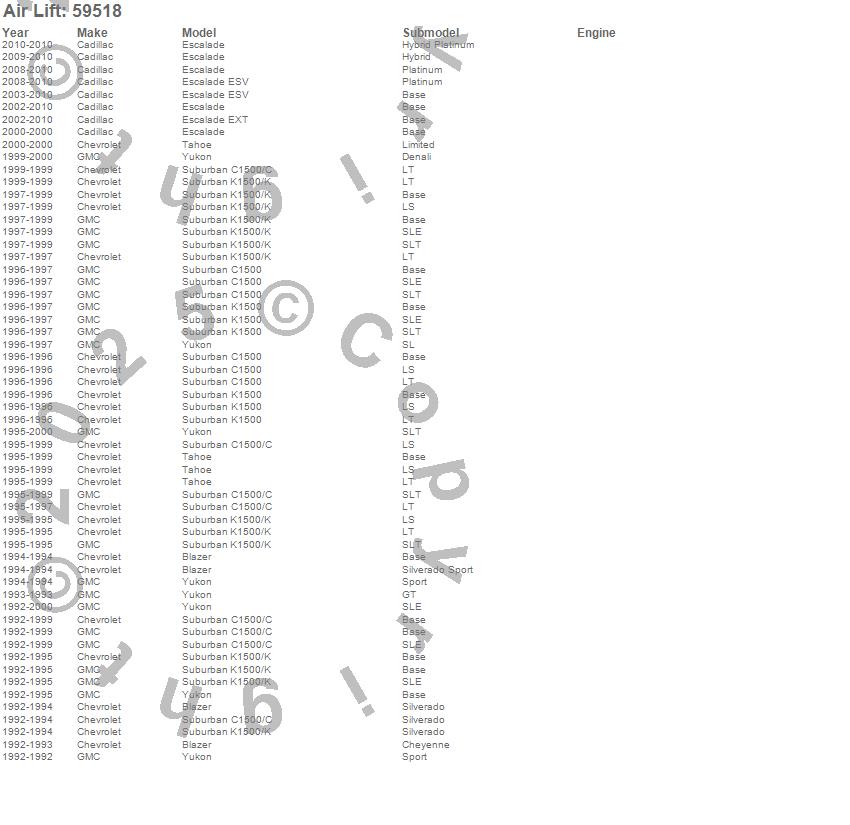 Below is an abreviated list of applications for the Ride Control Kit.