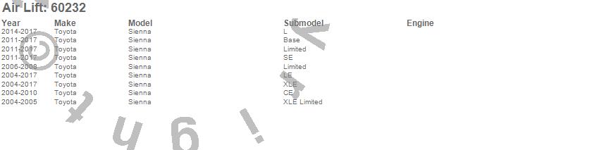 Below is an abreviated list of applications for the Air Lift 1000 Replacement Bag.