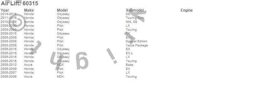 Below is an abreviated list of applications for the Air Lift 1000 Replacement Bag. MDX, Odyssey, Pilot, Acura, Honda, 2016, 2015, 2014, 2013, 2012, 2011, 2010, 2009, 2008, 2007, 2006, 2005 more…