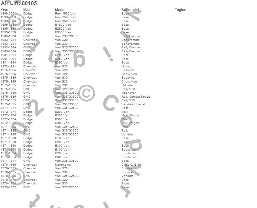 B100 Van, B150 Van, B1500 Van, B200 Van, B250 Van, B2500 Van, B300 Van, B350 Van, B3500 Van, G20 Van, G25/G2500 Van, G30 Van, G35/G3500 Van, Motorhome, Ram 1500 Van, Ram 2500 Van, Ram 3500 Van, Chevrolet, Dodge, GMC more…
