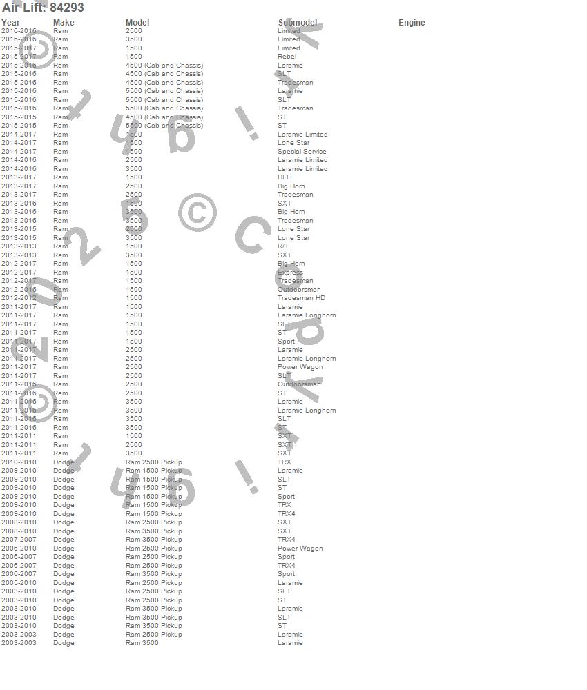 Below is an abreviated list of applications for the LoadLifter 5000 Ultimate Replacement Air Spring.
