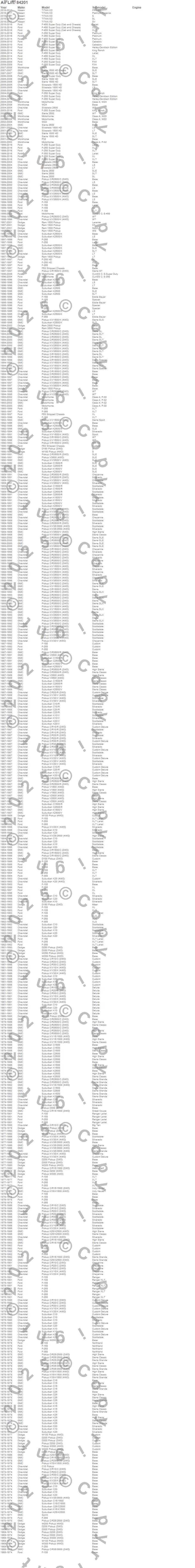 C10 Pickup, C10 Suburban, C15 Suburban, C15/C1500, C15/C1500 Suburban, C1500, C1500 Pickup, C1500 Suburban, C20 Pickup, C20 Suburban, C25 Suburban, C25/C2500 Pickup, C25/C2500 Suburban, C2500 Pickup, C2500 Suburban, C30 Pickup, C35/C3500 Pickup, C3500 Pickup, D100 Pickup, D150 Pickup more…