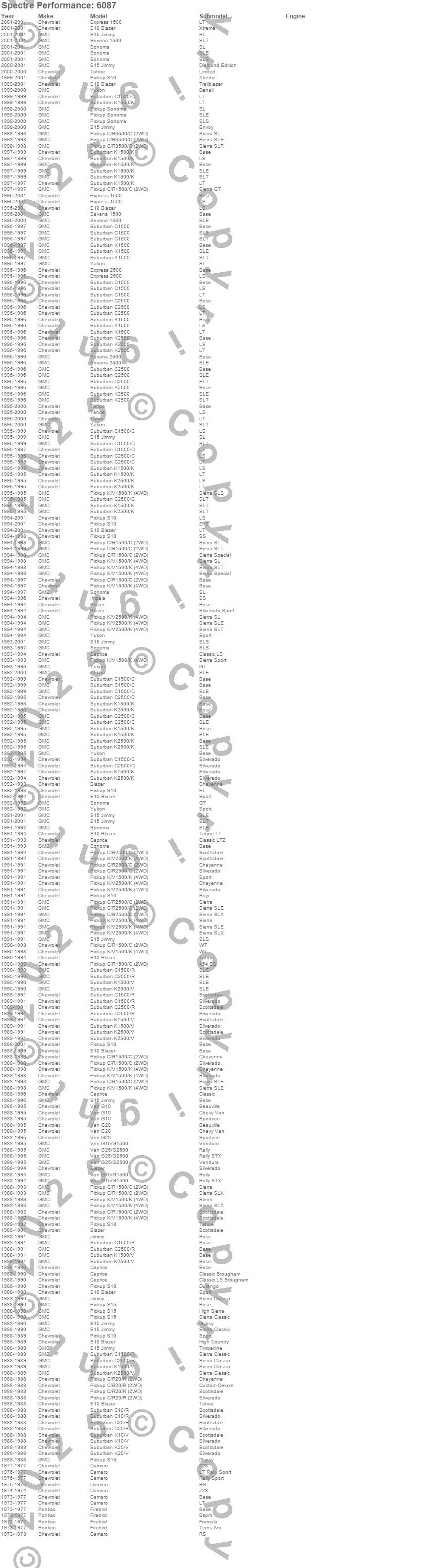 Blazer, C1500, C1500 Pickup, C1500 Suburban, C2500 Pickup, C2500 Suburban, C3500 Pickup, Camaro, Caprice, Express 1500, Express 2500, Firebird, Firebird Trans Am, G10 Van, G15/G1500 Van, G20 Van, G25/G2500 Van, Impala, Jimmy, K1500 more…