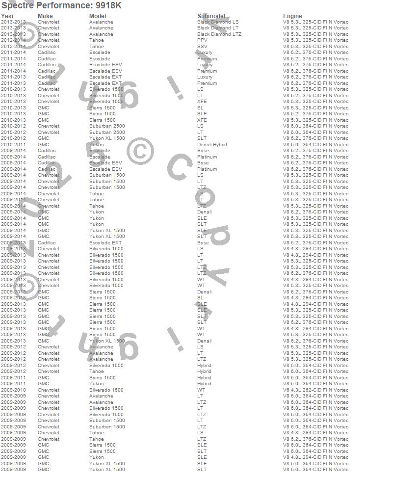 Below is an abreviated list of applications for the Air Intake Kit.