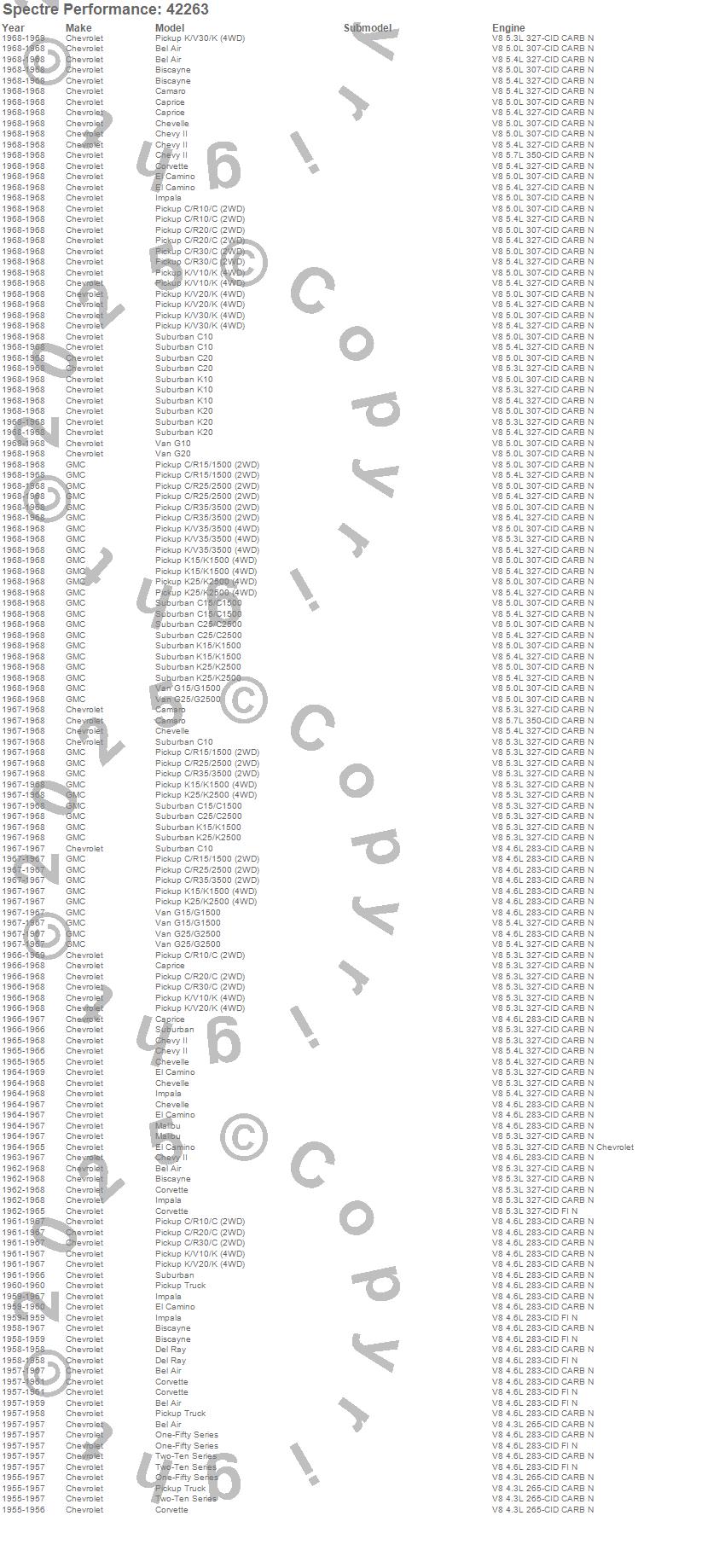 Bel Air, Biscayne, C10 Pickup, C10 Suburban, C15/C1500, C15/C1500 Suburban, C20 Pickup, C20 Suburban, C25/C2500 Pickup, C25/C2500 Suburban, C30 Pickup, C35/C3500 Pickup, Camaro, Caprice, Chevelle, Chevy II, Corvette, Del Ray, El Camino, G10 Van more...