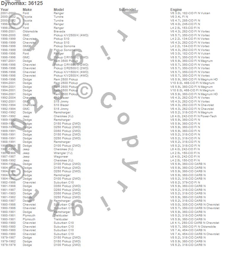 Bravada, C10 Suburban, C1500 Pickup, C2500 Pickup, Cherokee (XJ), D100 Pickup, D150 Pickup, D250 Pickup, D350 Pickup, K1500 Pickup, K2500 Pickup, Ram 2500, Ram 3500, Ramcharger, Ranger, S10 Blazer, S10 Blazer (Canadian), S10 Pickup, S15 Jimmy, Sonoma more…
