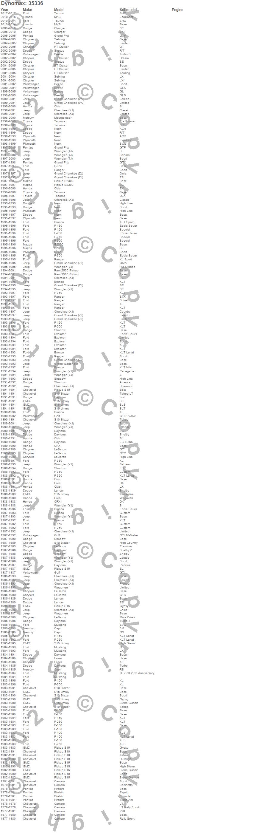 300, Beetle, Bronco, Camaro, Capri, Charger, Cherokee (XJ), Civic, Corvette, Cougar, CRX, Daytona, Explorer, F-150, F-250, F-350, Firebird, Golf, Grand Cherokee (WJ), Grand Cherokee (ZJ) more…