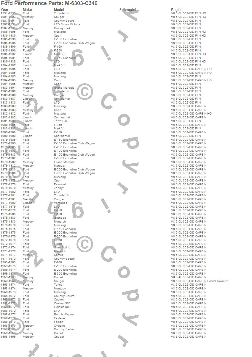 Capri, Colony Park, Comet, Continental, Cougar, Country Sedan, Country Squire, Custom, Custom 500, Cyclone, E-100 Econoline, E-150 Econoline, E-150 Econoline Club Wagon, E-200 Econoline, E-250 Econoline, E-300 Econoline, E-350 Econoline, F-100, F-150, F-250 more…