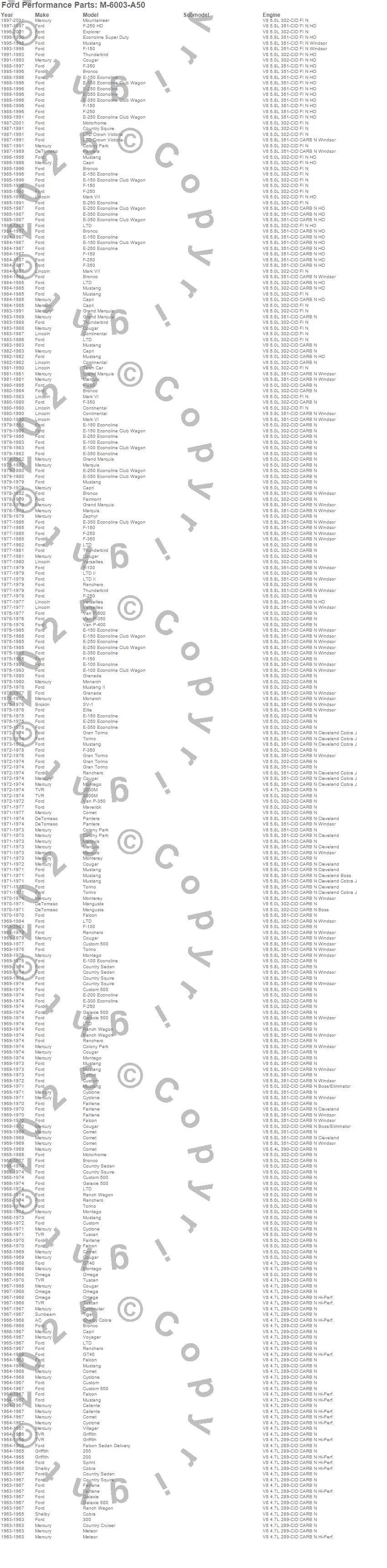 200, 3000M, Bronco, Caliente, Capri, Club Cargo, Club Wagon, Cobra, Colony Park, Comet, Commuter, Continental, Cougar, Country Cruiser, Country Sedan, Country Squire, Custom, Custom 500, Cyclone, E Super Duty more…