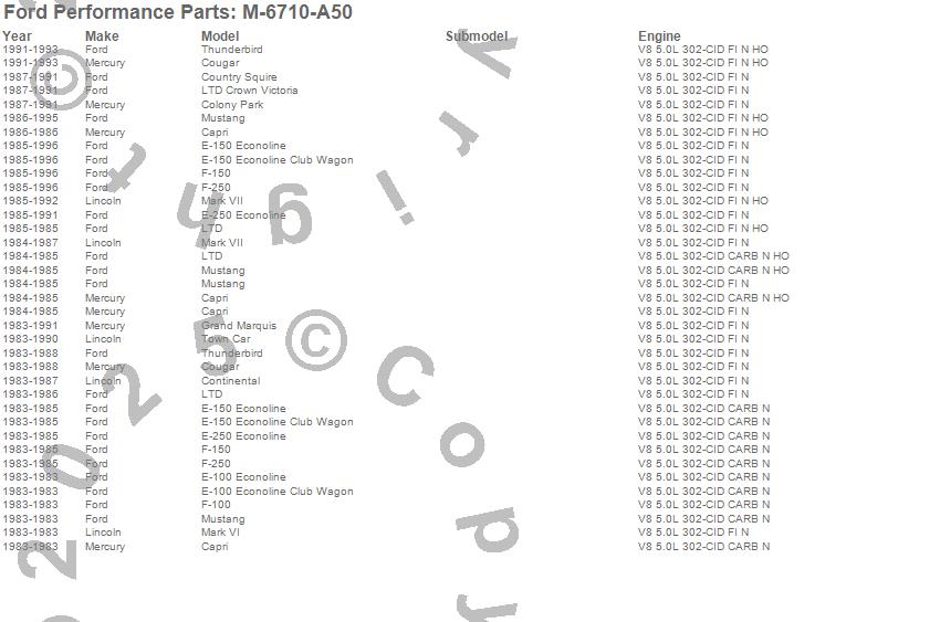Capri, Colony Park, Continental, Cougar, Country Squire, E-100 Econoline, E-150 Econoline, E-150 Econoline Club Wagon, E-250 Econoline, F-100, F-150, F-250, Grand Marquis, LTD, LTD Crown Victoria, Mark VI, Mark VII, Marquis, Mustang, Thunderbird more…