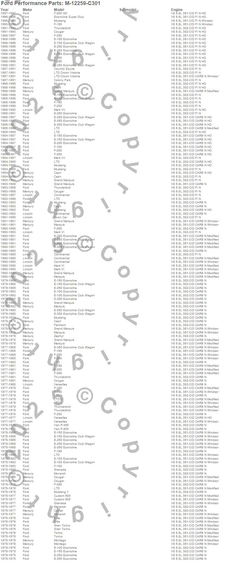 Capri, Colony Park, Comet, Continental, Cougar, Country Squire, Custom 500, E Super Duty, E-100 Econoline, E-100 Econoline Club Wagon, E-150 Econoline, E-150 Econoline Club Wagon, E-250 Econoline, E-250 Econoline Club Wagon, E-350 Econoline, E-350 Econoline Club Wagon, Elite, F-100, F-150, F-250 more…