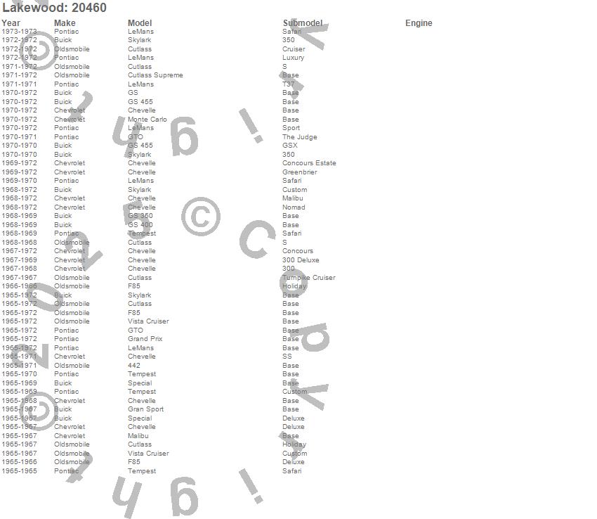 442, Chevelle, Cutlass, Cutlass Supreme, F85, Gran Sport, Grand Prix, GS, GS 350, GS 400, GS 455, GTO, LeMans, Malibu, Monte Carlo, Skylark, Special, Tempest, Vista Cruiser, Buick more…