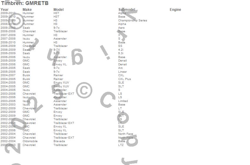 9-7X, Ascender, Bravada, Envoy, Envoy XL, Envoy XUV, H3, H3T, Rainier, Trailblazer, Trailblazer EXT, Buick, Chevrolet, GMC, Hummer, Isuzu, Oldsmobile, Saab, 2010, 2009 more…