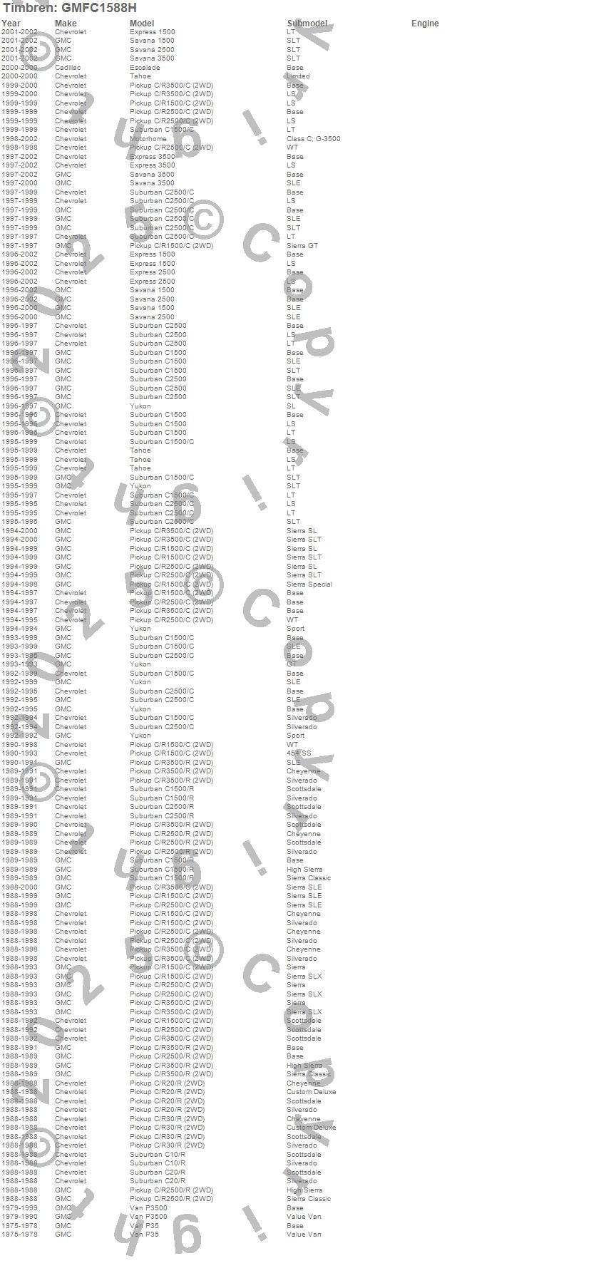 Blazer, C1500, C1500 Pickup, C1500 Suburban, C2500 Pickup, C2500 Suburban, C3500 Pickup, Escalade, Express 1500, Express 2500, Express 3500, P35 Van, P3500 Van, R10 Suburban, R1500 Suburban, R20 Pickup, R20 Suburban, R2500 Pickup, R2500 Suburban, R30 Pickup more…