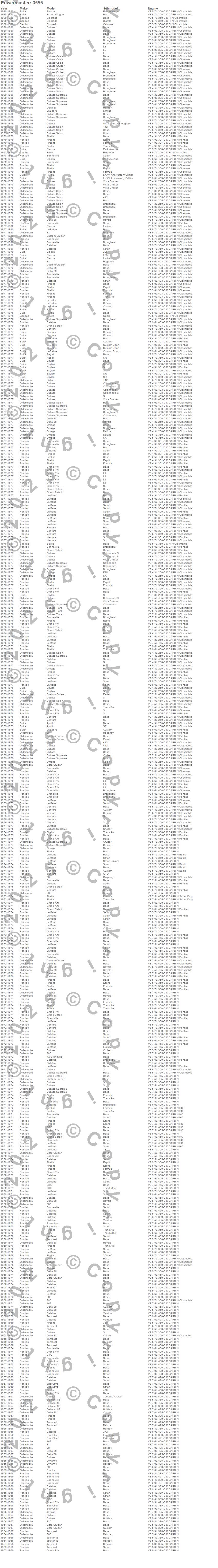 442, 98, Apollo, Bonneville, Catalina, Catalina Ventura, Century, Custom Cruiser, Cutlass, Cutlass Calais, Cutlass Cruiser, Cutlass Salon, Cutlass Supreme, Cutlass Tiara, Delmont 88, Delta 88, Dynamic, Eldorado, Electra, Estate Wagon more…