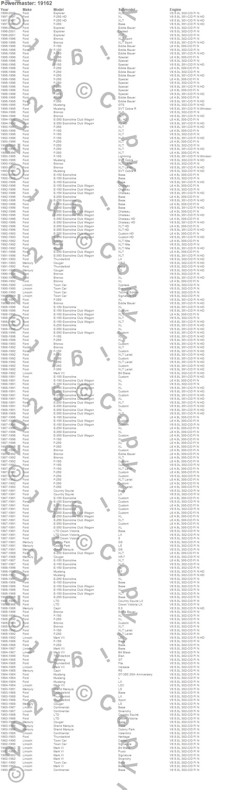 Bronco, Capri, Colony Park, Continental, Cougar, Country Squire, E-150 Econoline, E-150 Econoline Club Wagon, E-250 Econoline, E-250 Econoline Club Wagon, E-350 Econoline, E-350 Econoline Club Wagon, Explorer, F-150 Pickup, F-250 Pickup, F-350 Pickup, Grand Marquis, LTD, LTD Crown Victoria, Mark VI more…