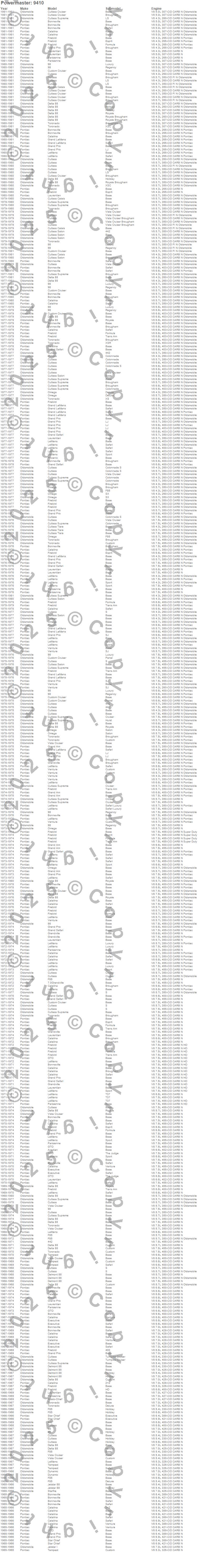 442, 98, Apollo, Bonneville, Catalina, Catalina Ventura, Century, Chieftain, Custom Cruiser, Cutlass, Cutlass Calais, Cutlass Cruiser, Cutlass Salon, Cutlass Supreme, Cutlass Tiara, Delmont 88, Delta 88, Dynamic, Eldorado, Electra more…