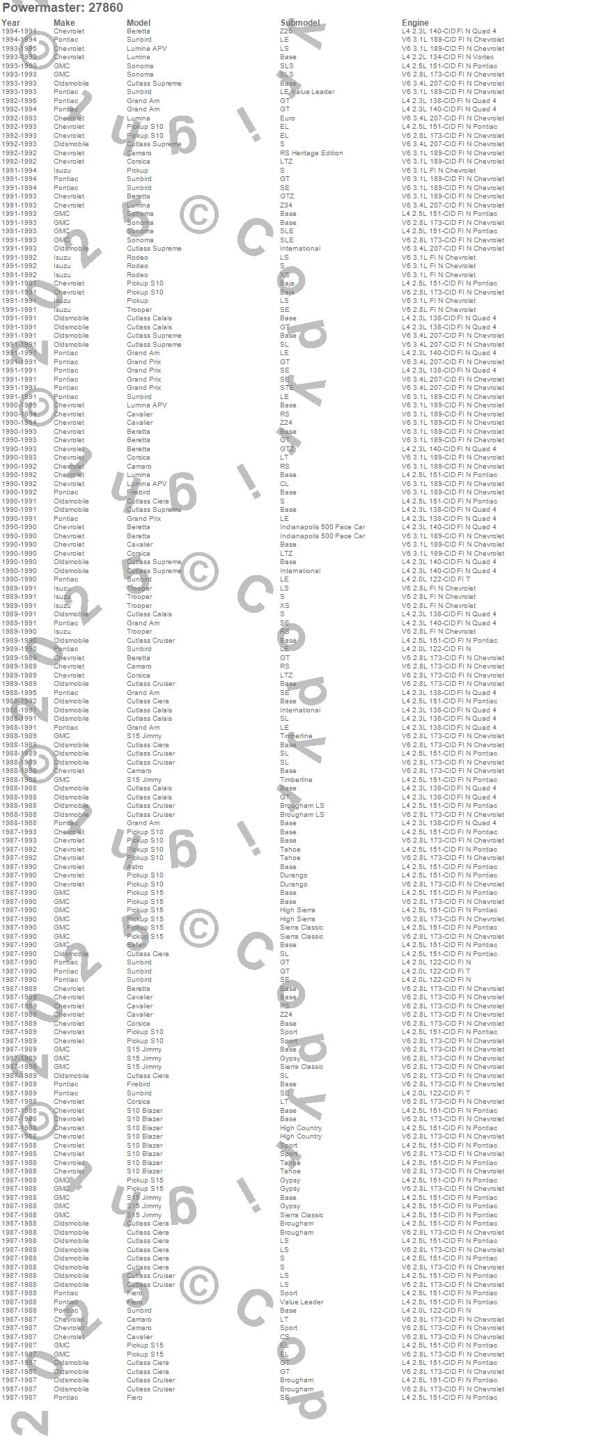 Astro, Beretta, Camaro, Cavalier, Corsica, Cutlass Calais, Cutlass Ciera, Cutlass Cruiser, Cutlass Supreme, Fiero, Firebird, Grand Am, Grand Prix, Lumina, Lumina APV, Pickup, Rodeo, S10 Blazer, S10 Pickup, S15 Jimmy more…