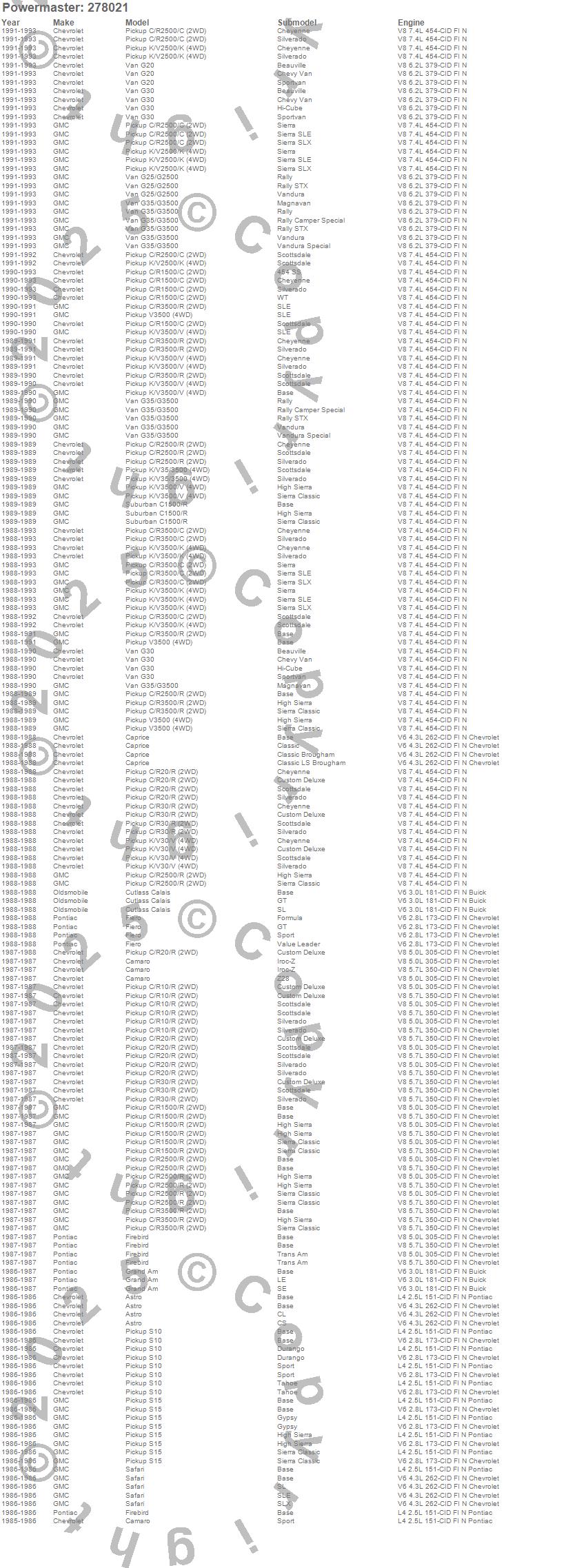 Astro, C1500 Pickup, C2500 Pickup, C3500 Pickup, Camaro, Caprice, Cutlass Calais, Fiero, Firebird, G20, G2500, G30, G30 Van, G35/G3500 Van, G3500, Grand Am, K2500 Pickup, K3500 Pickup, R10 Pickup, R1500 Pickup more…