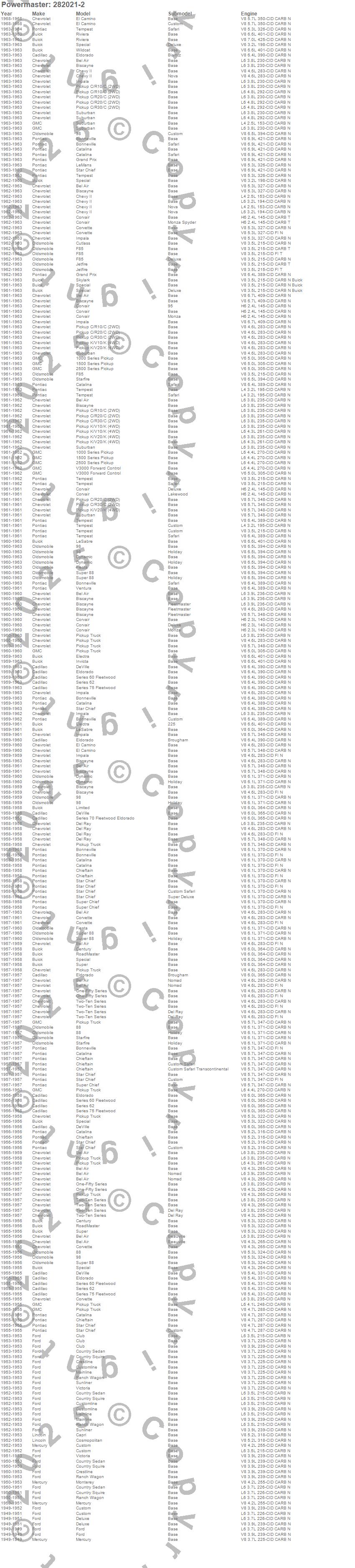 1000 Series Pickup, 1500 Series Pickup, 2500 Series Pickup, 88, 98, Bel Air, Biscayne, Bonneville, C10 Pickup, C20 Pickup, C30 Pickup, Capri, Catalina, Century, Chevy II, Chieftain, Club Cargo, Corvair, Corvette, Cosmopolitan more…