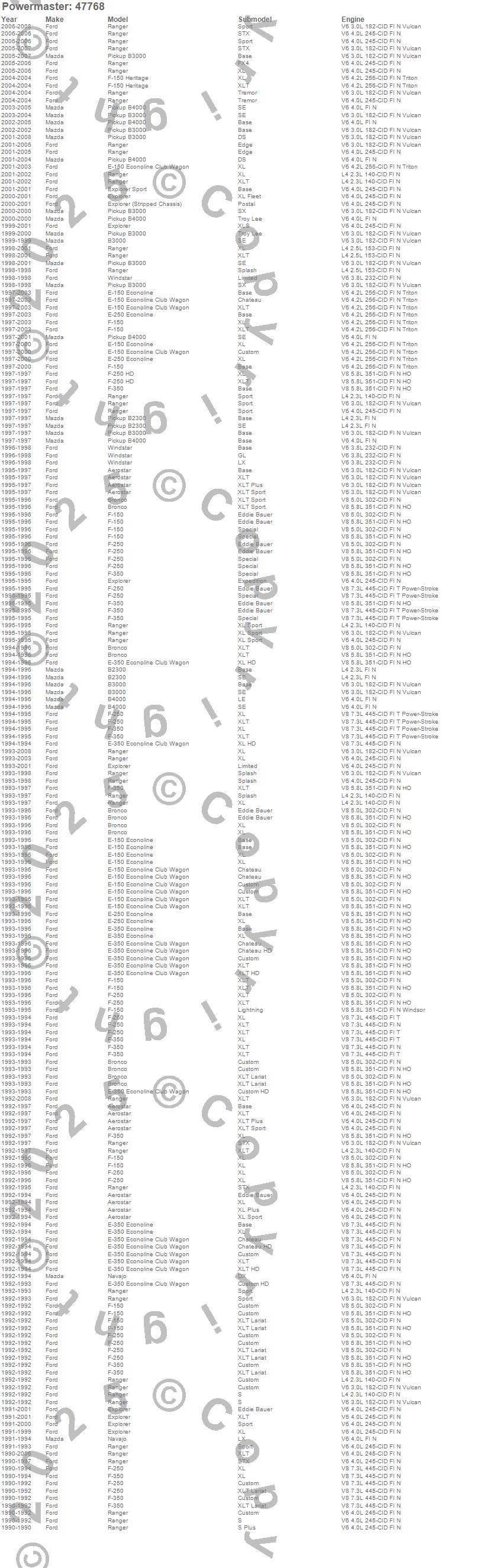 Aerostar, B2300, B3000, B4000, Bronco, E-150 Econoline, E-150 Econoline Club Wagon, E-250 Econoline, E-350 Econoline, E-350 Econoline Club Wagon, Explorer, F-150 Pickup, F-250 Pickup, F-350 Pickup, Navajo, Ranger, Windstar, Ford, Mazda, 2002 more…