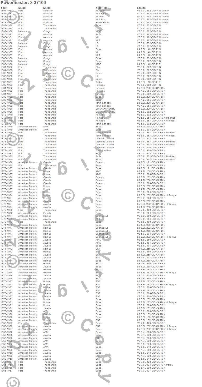 Aerostar, AMX, Cougar, Gremlin, Hornet, Javelin, Thunderbird, American Motors, Ford, Mercury, 1991, 1990, 1989, 1988, 1987, 1986, 1985, 1984, 1983, 1982 more…