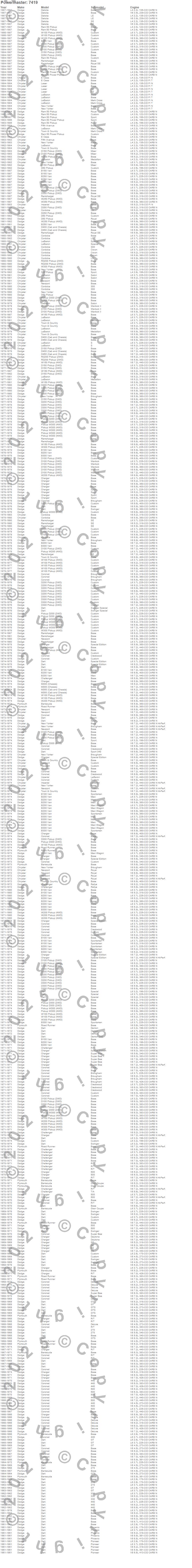B100 Van, B150 Van, B200 Van, B250 Van, B300 Van, B350 Van, Barracuda, Challenger, Charger, Cordoba, Coronet, D100 Pickup, D150 Pickup, D200 Pickup, D250 Pickup, D300 Pickup, D350 Pickup, D450 Pickup, D50 Pickup, Dakota more…