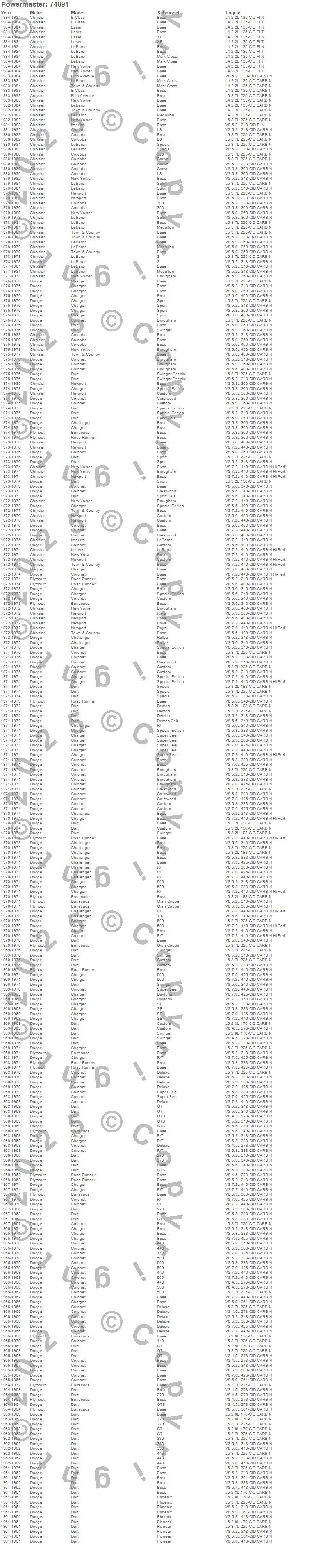 Barracuda, Challenger, Charger, Cordoba, Coronet, Dart, E Class, Fifth Avenue, Imperial, Laser, LeBaron, New Yorker, Newport, Road Runner, Town & Country, Chrysler, Dodge, Plymouth, 1984, 1983 more…