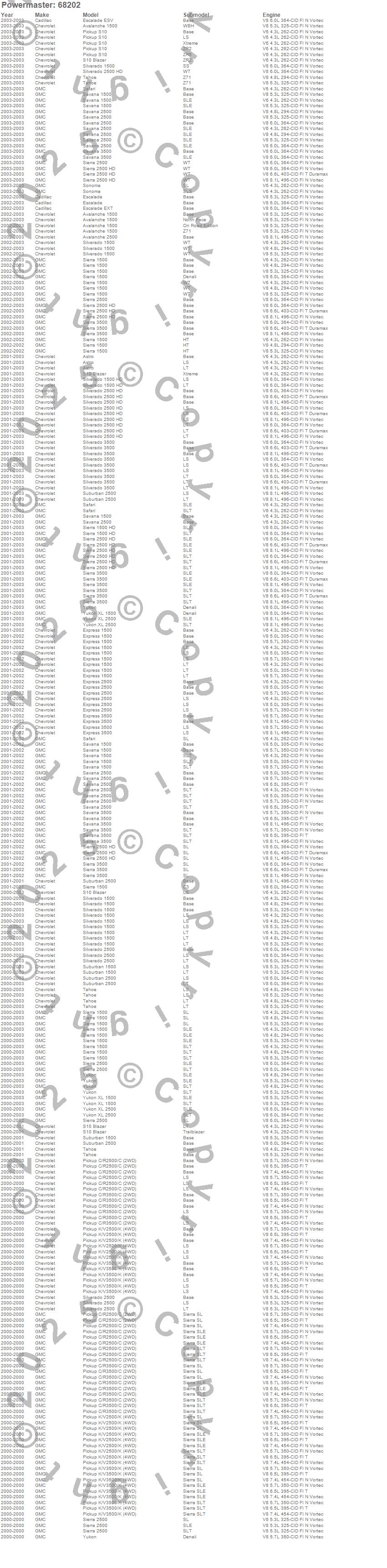 Astro, Avalanche 1500, Avalanche 2500, C2500 Pickup, C3500 Pickup, Escalade, Escalade ESV, Escalade EXT, Express 1500, Express 2500, Express 3500, K2500 Pickup, K3500 Pickup, S10 Blazer, S10 Pickup, Safari, Savana 1500, Savana 2500, Savana 3500, Sierra 1500 more…