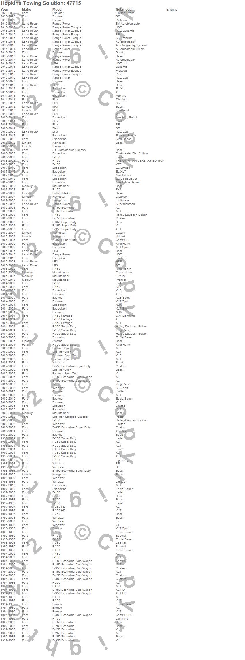 Bronco, E-150 Econoline, E-150 Econoline Club Wagon, E-250 Econoline, E-350 Econoline, E-350 Econoline Club Wagon, E-350 Super Duty, Excursion, Expedition, Explorer, F-150, F-150 Heritage, F-250, F-250 Super Duty, F-350, F-350 Super Duty, Flex, LR3, LR4, MKT more…